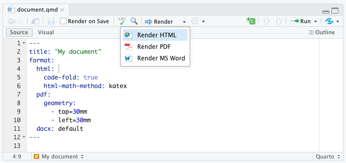---Note that our format choice (HTML) is not even reflected in the YAML as it is the default output format for Quarto documents. However you can directly edit the YAML to change the output format, e.g. to PDF (pdf) or MS Word (docx). Add format: pdf to your document’s YAML as shown below.